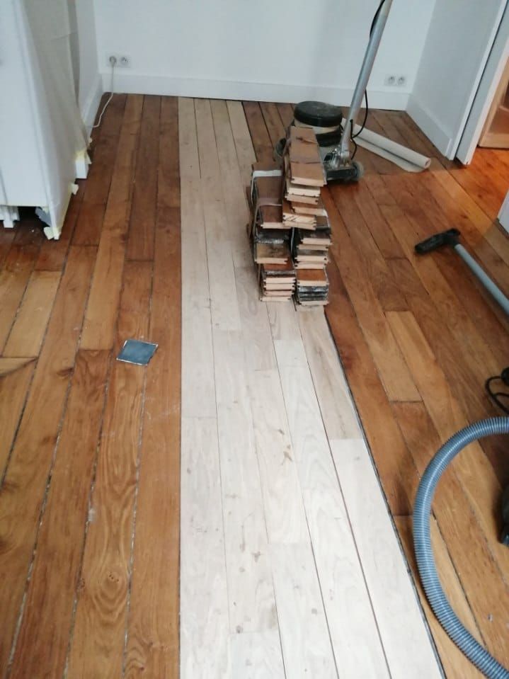 - Ponçage du parquet avec égrainage de plus en plus fin et finition à la monobrosse